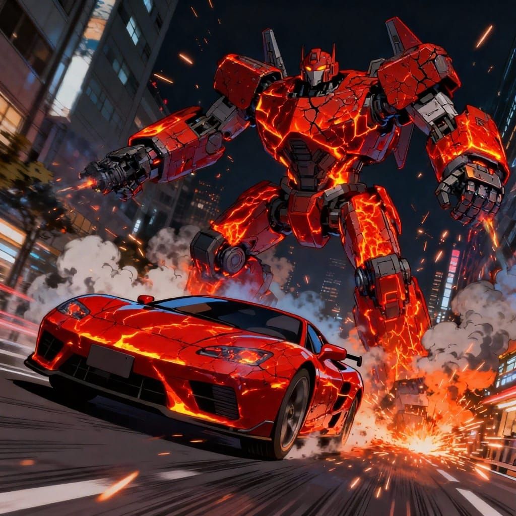 This image depicts an old bus undergoing a dramatic transformation into a molten lava tank. Armor plates emerge, revealing glowing magma within, with fiery exhaust and smoke.