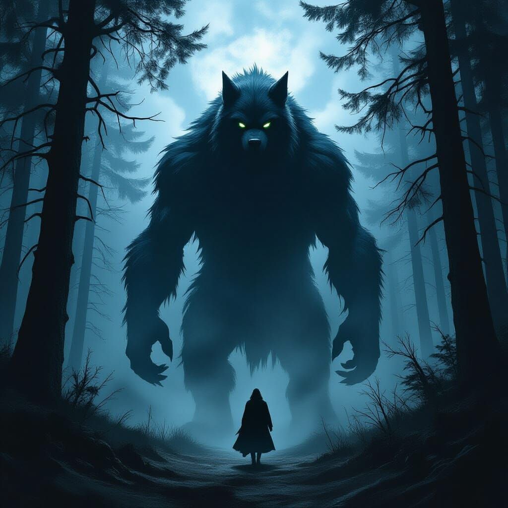 This image showcases a colossal, shadowy dog-like creature emerging from a dark, misty forest, designed in a gothic aesthetic with dramatic lighting. It evokes cosmic horror and primal transformation.