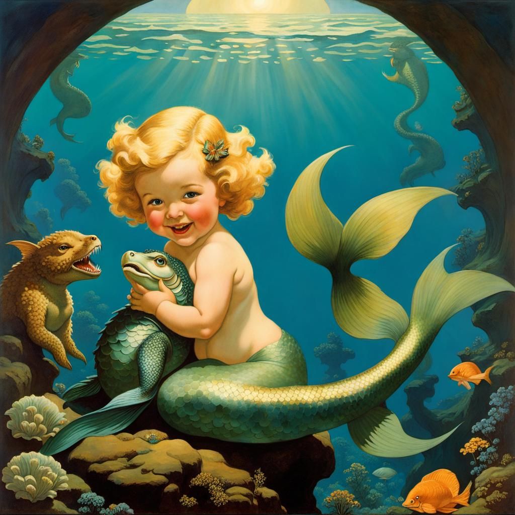 A whimsical painting of a vintage-style mermaid child embracing a Lovecraftian pet with laughter. The artwork evokes Maxfield Parrish's style, featuring vibrant colors and fantastical realism.
