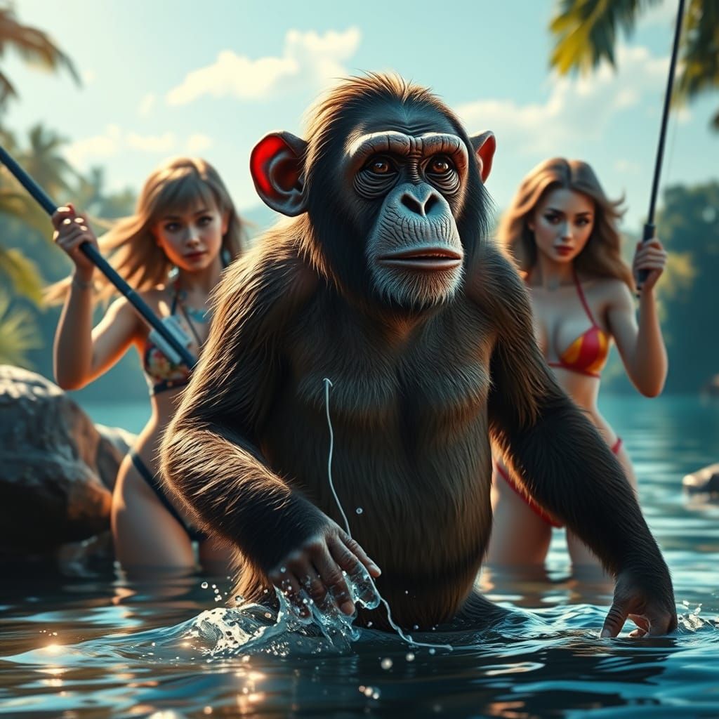 This image shows a chimpanzee fly fishing in a river, observed by two admirers. The portrait uses dynamic lighting and intricate details, with triadic colors in a splash art style.