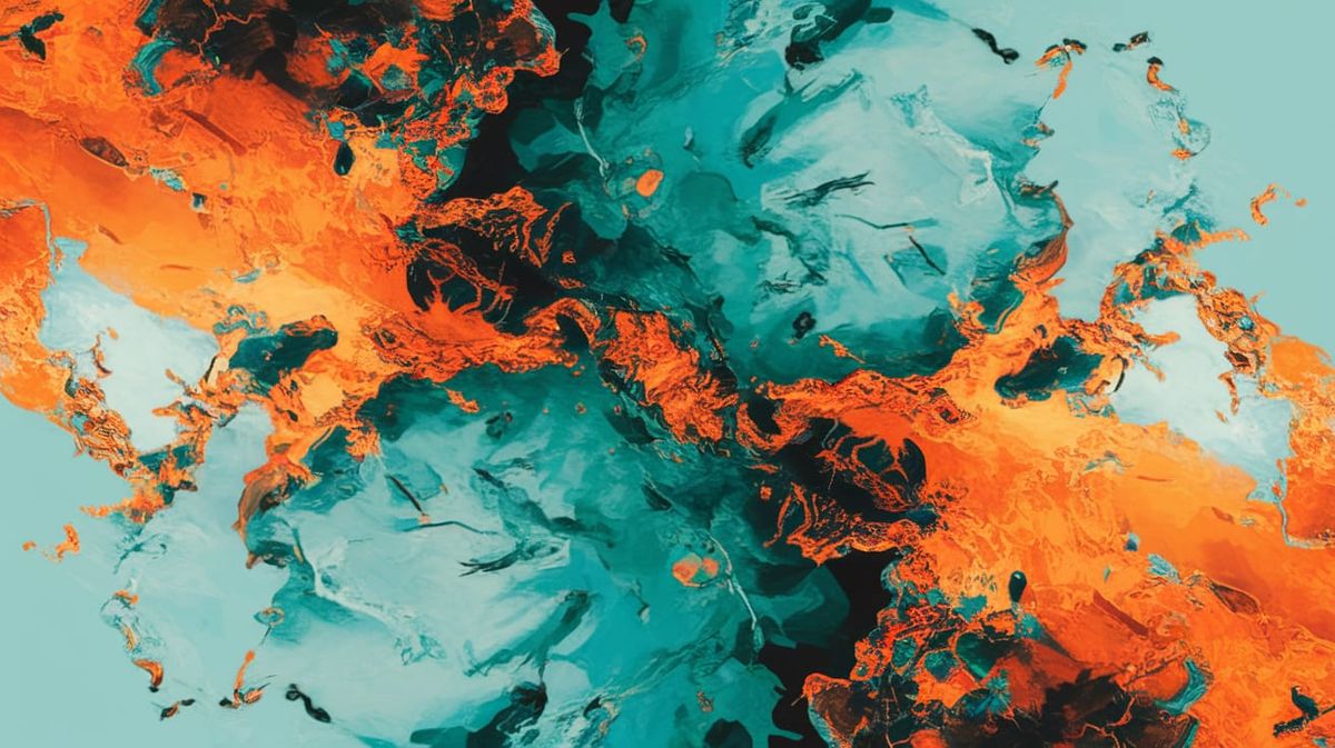 This image shows an abstract drawing in refreshing shades of blue-green and rustic orange. The iridescent ink creates a monumental effect with a cool aesthetic.