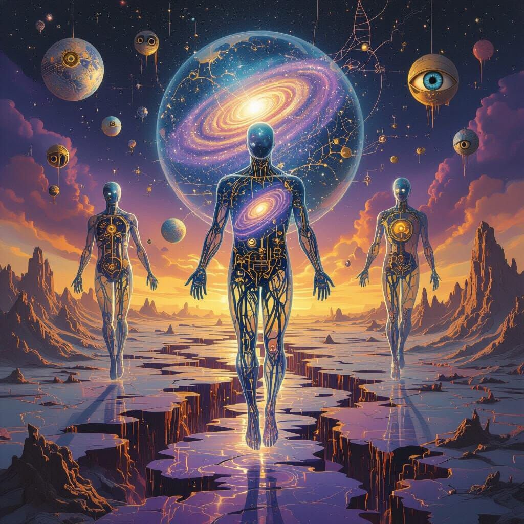 A striking picture of weightless, semi-transparent human figures with tree-like neural roots drifting through a melting landscape. This digital art features a rich, dreamlike color palette and surreal elements.