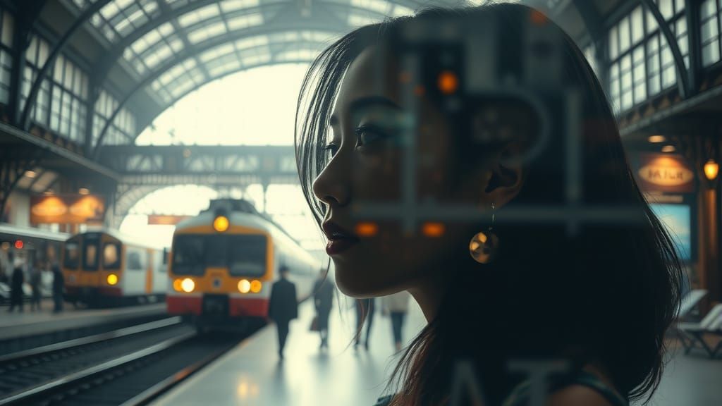 This image shows a beautiful Asian woman's silhouette set against a vibrant, surreal steampunk train station backdrop, blending modern and vintage elements in a unique double-exposure effect.