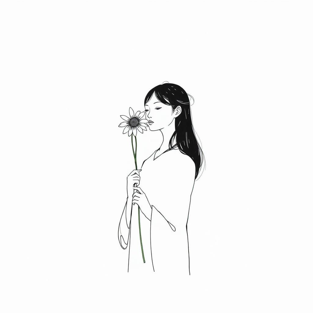 This image shows a minimalist sketch of a woman holding a flower. The artwork is rendered in a minimalist style, reminiscent of modern Japanese art.