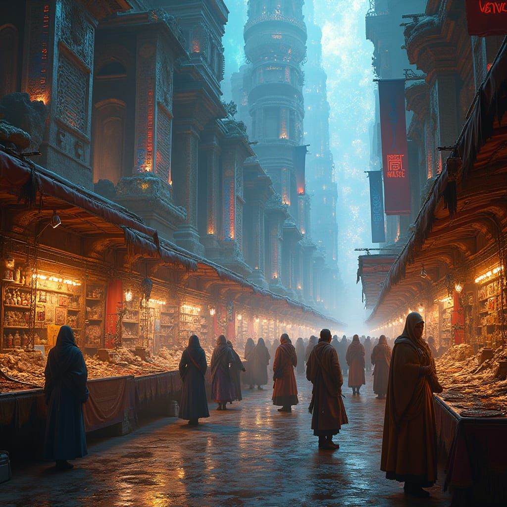 A digital rendering of a bustling, otherworldly marketplace. Humans, mythical creatures, and cyborgs mingle among colorful fabrics, glowing neon lights, and holographic ads in a cyberpunk aesthetic.