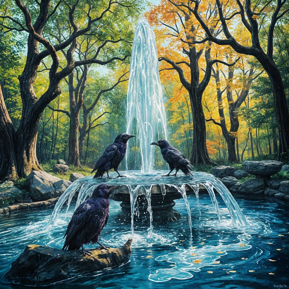 This image shows a magical fountain with bioluminescent water and colorful drops, surrounded by ravens in a tree of life forest. Rendered in gouache and watercolor with thick, textured brush strokes.
