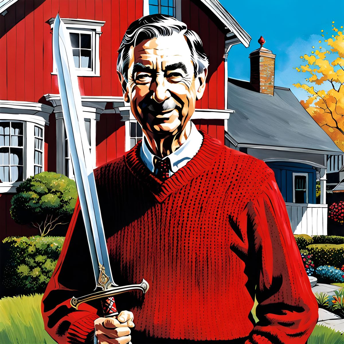 A vibrant closeup portrait of Mr. Rogers in a red sweater, wielding a large sword in front of a sunny house, as graffiti art.
