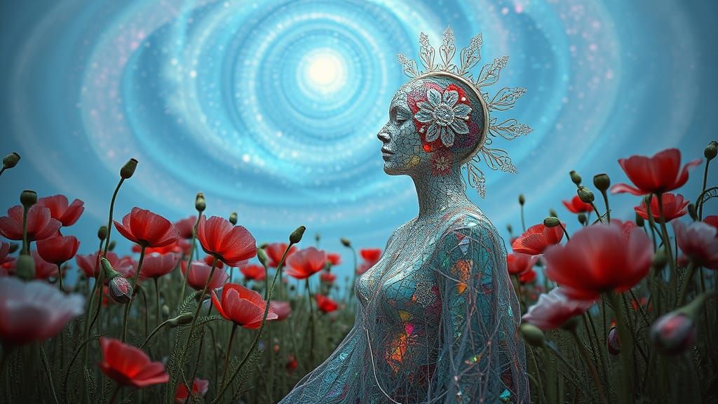 A striking picture of a beautiful woman composed of strings, flowers, and silver filigree. The eco-art style image blends human and landscape into a unified expression.