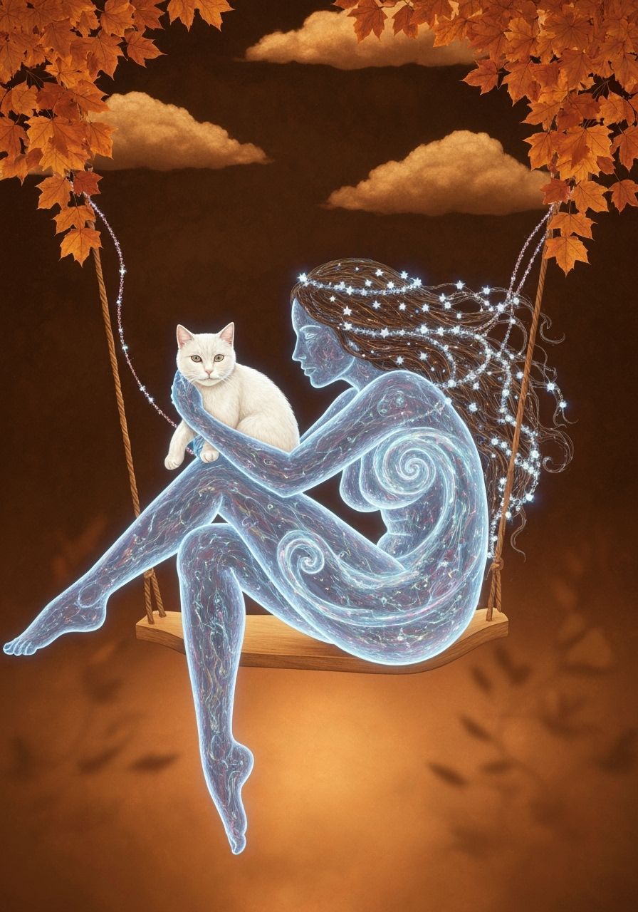 This surreal artwork features a transparent woman holding a white cat within a swirling, watery substance illuminated by bioluminescent light and plasma portals. Shimmering stars entwine her hair, with crochet threads connecting to autumn leaves under a copper sky.