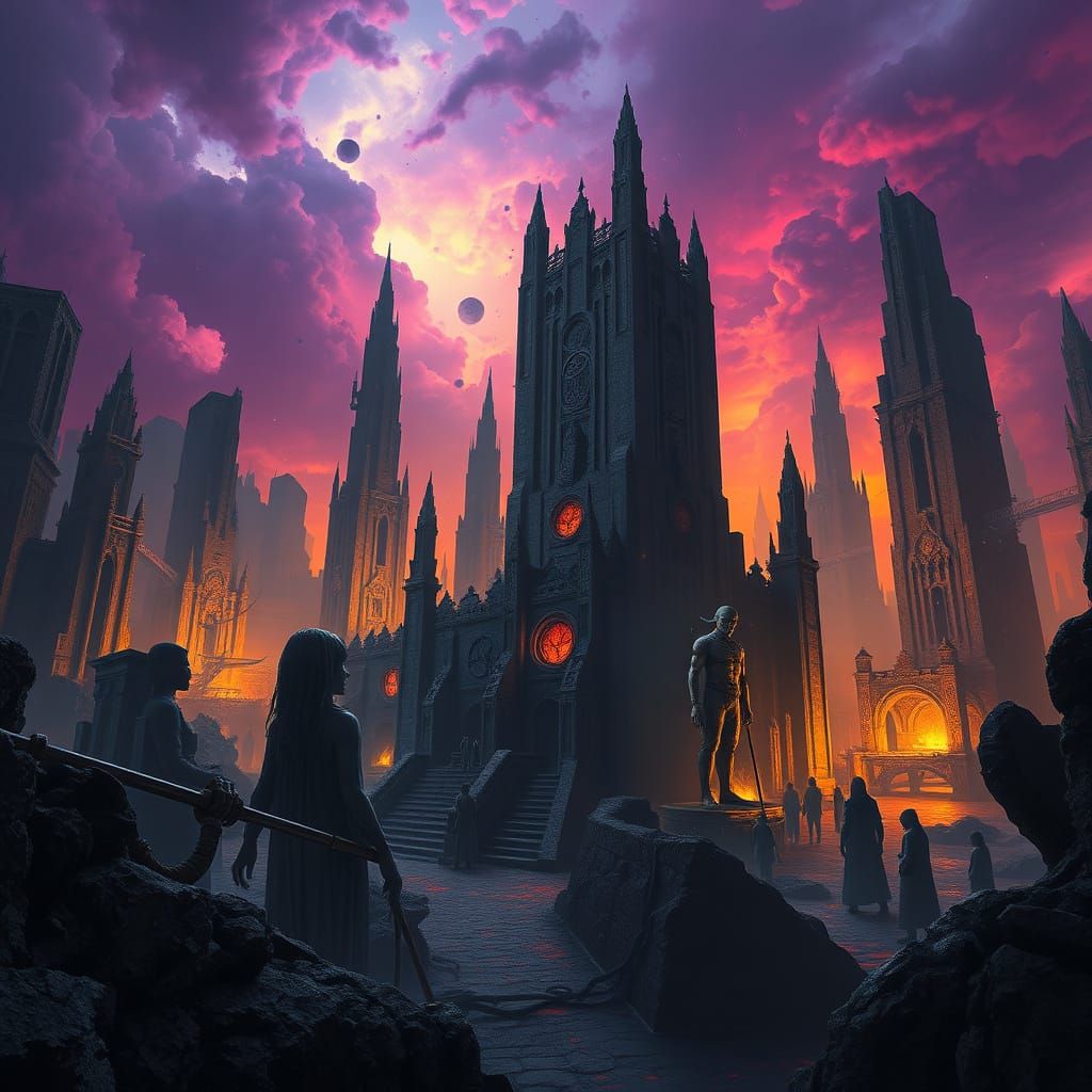 A dark fantasy masterpiece of cosmic horror, where ancient structures loom with grotesque carvings and reality twists unnaturally. Faint whispers crawl into the mind, and shadows move just out of sight, evoking dread and cosmic insignificance in a world of immense, lurking horror.