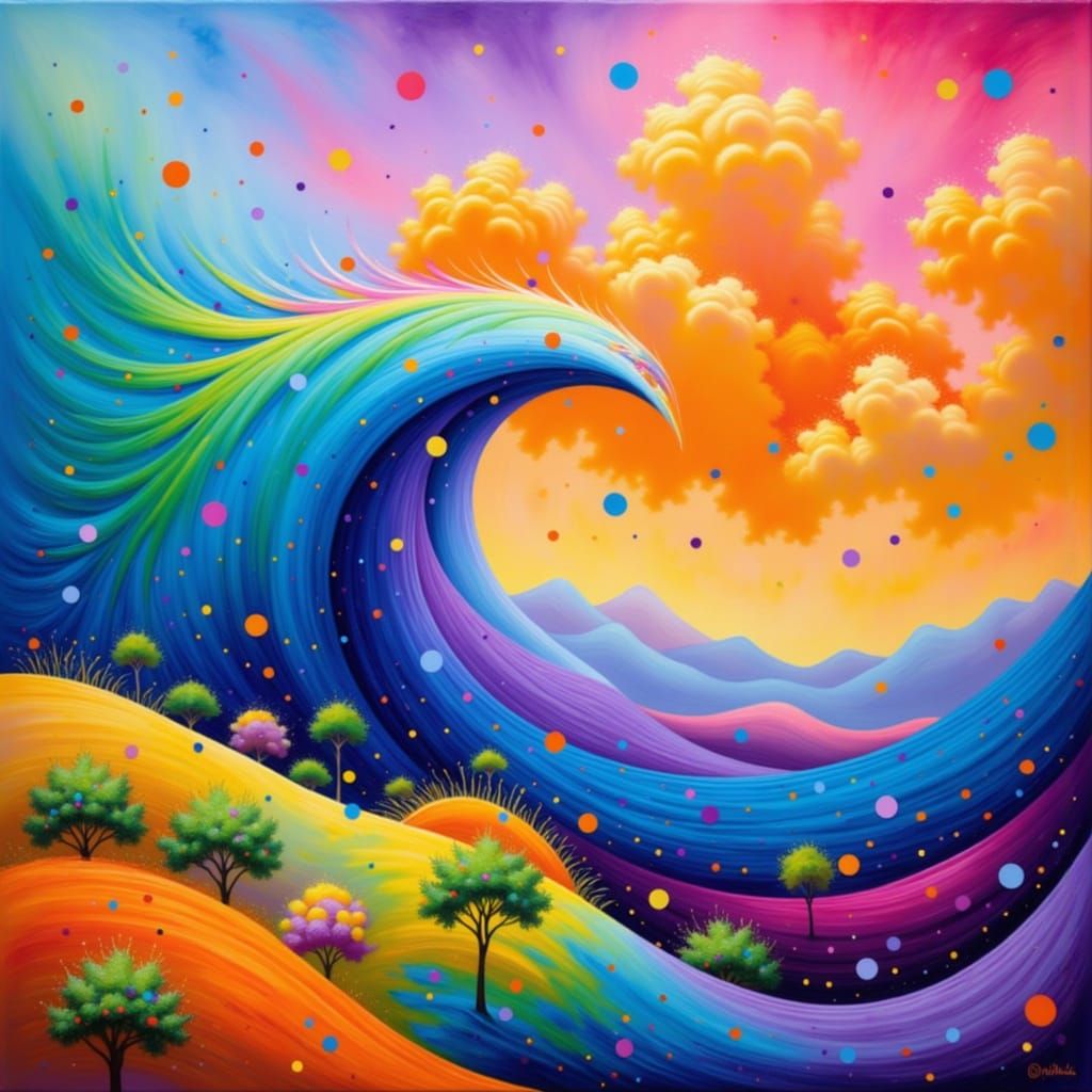 A striking painting of a powerful female figure riding the wind, surrounded by bright and colorful swirling patterns, evoking a sense of freedom and strength.