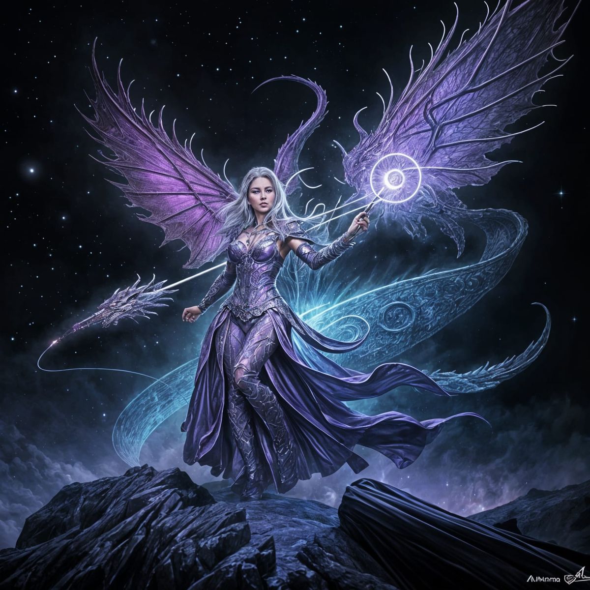 This cosmic illustration shows a purple dragon soaring through clouds, emitting silver mist. A woman with silver hair and dark skin rides it, holding a glowing purple staff. Rendered in a mixed media style.