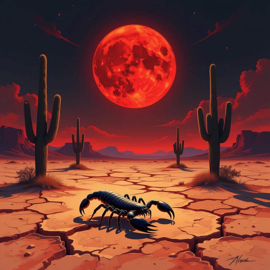 This digital painting depicts a lone scorpion in a cracked desert under a blood-red moon. Surrealist style, vivid colors, and dramatic lighting create a haunting atmosphere with a faint glow.