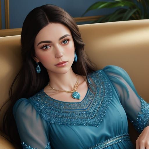 A realistic portrait of a brunette woman reclining on a couch. She wears a blue dress and heart-shaped diamond necklace, bathed in soft, warm, golden hour lighting. The image is highly detailed.