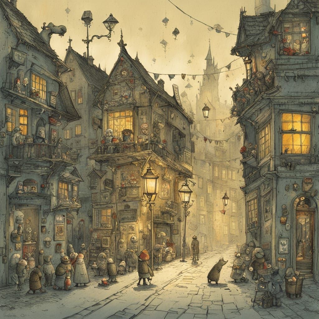 This image shows an old street lantern illuminating a dark alleyway. Golden light and glowing rat eyes create a moody atmosphere. The artwork is rendered with thick brushstrokes in a gouache style.