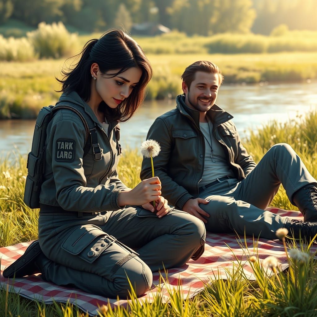 This image shows a woman with cybernetic eyes kneeling in a meadow, examining a dandelion. A man lounges nearby, with a skimmer in the background. The scene is rendered in a retro-futuristic style.