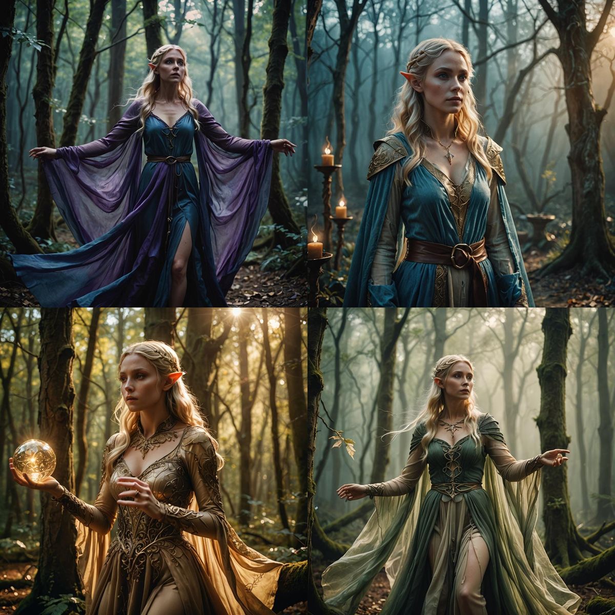 A cinematic film still of a shapely blonde elf woman dressed in silks as a mage within a fantasy setting. The image exhibits film grain and dramatic lighting.