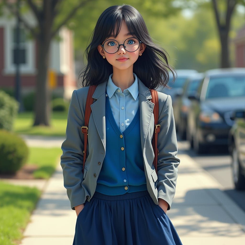 This image shows a hyperrealistic portrait of a young woman with black hair, blue eyes, and glasses, walking home from school. She wears a blue and gray sweater vest blazer.