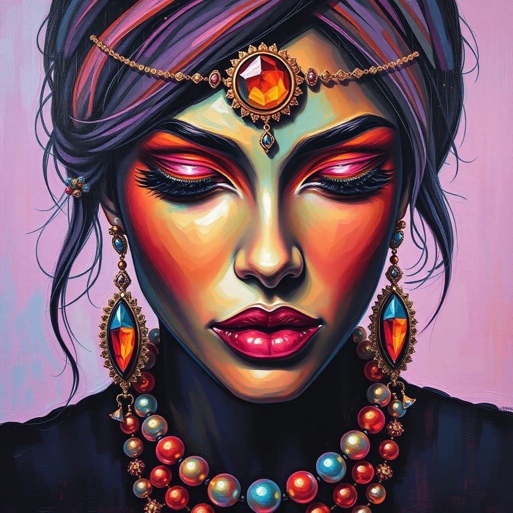 This image shows a vibrant, colorful face adorned with jewelry, rendered as an oil painting. The artwork features a downward-facing gaze, creating an intimate and emotional atmosphere.