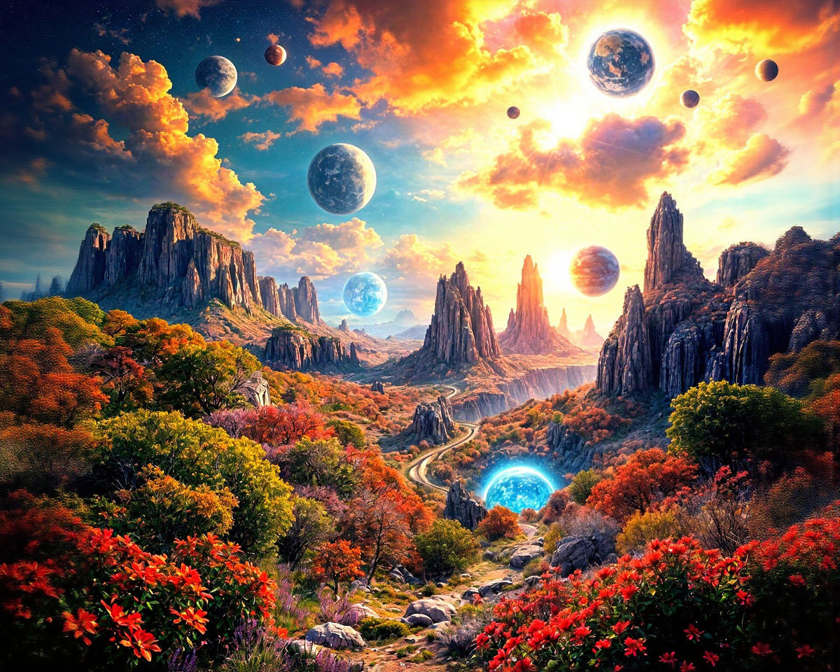 This image shows a vibrant fantasy landscape filled with luminous plants and celestial objects, set within a chaotic, cosmic scene. The image features an 8K resolution and a Kodak Ektar film aesthetic, with subtractive lighting and silver nitrate effects.