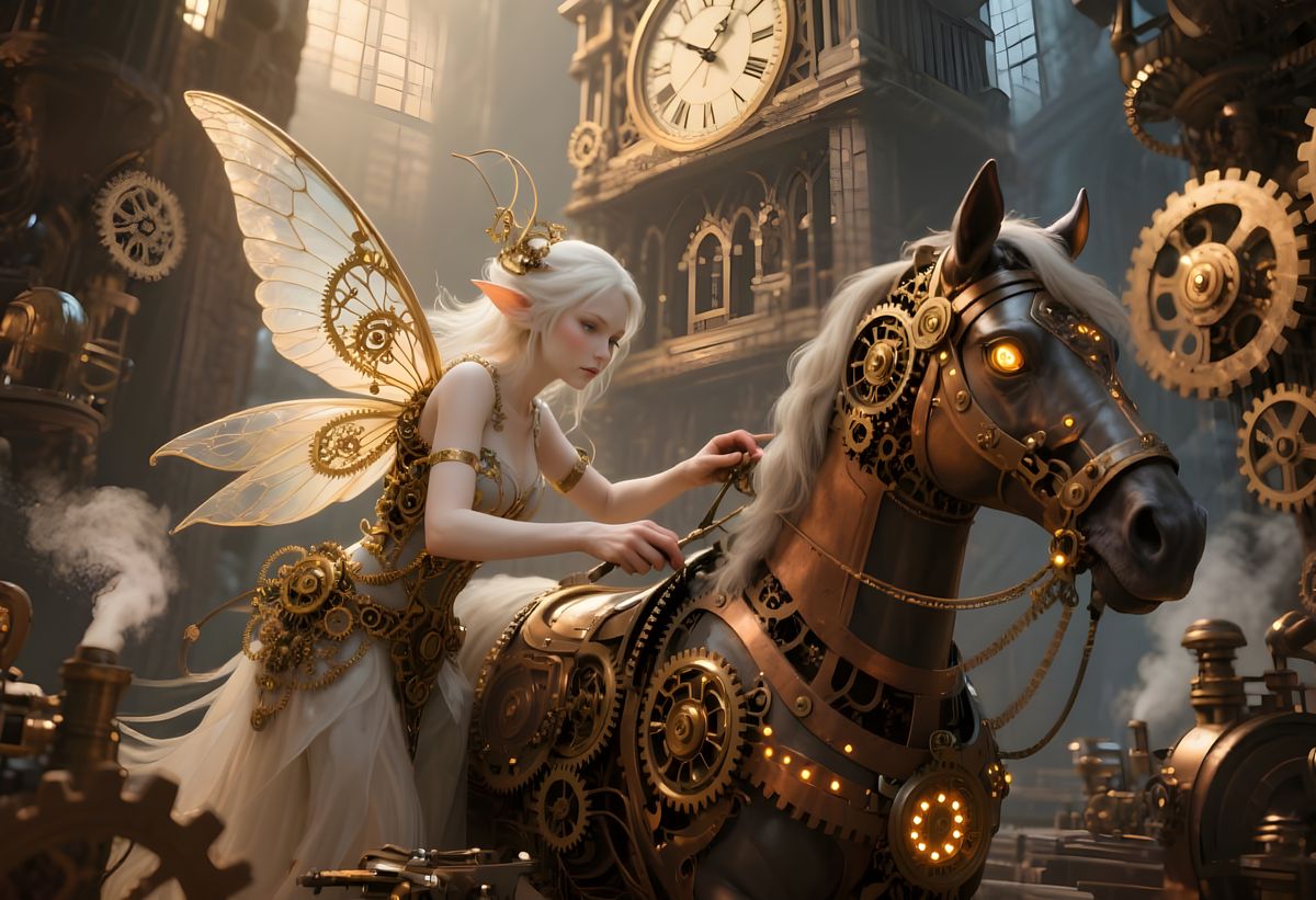 This image shows a steampunk fairy with clockwork wings building a clockwork horse inside a giant clock tower. The scene is filled with gears, steam-powered machines, and intricate details, rendered with warm gold, brown, and copper tones.