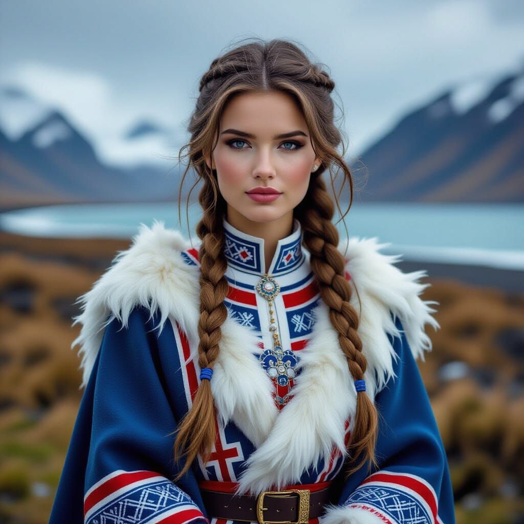 This image shows a beautiful young woman wearing traditional Icelandic clothing. The rendering is ultra-realistic and highly detailed, capturing the intricate textures and patterns of the garment.