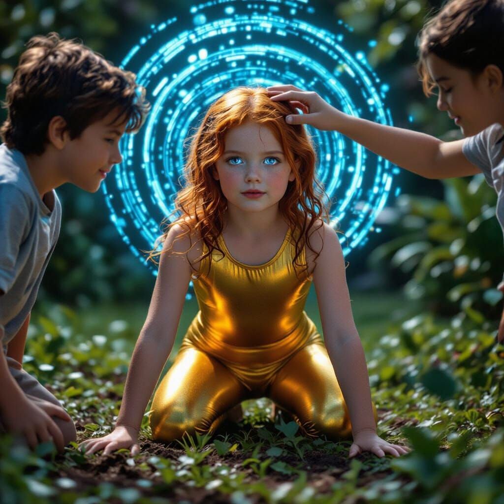 This image shows a redhead girl kneeling in a backyard, entranced by glowing blue spirals in her eyes. A boy touches her temple with electricity in this cinematic still with warm lighting and vibrant colors.