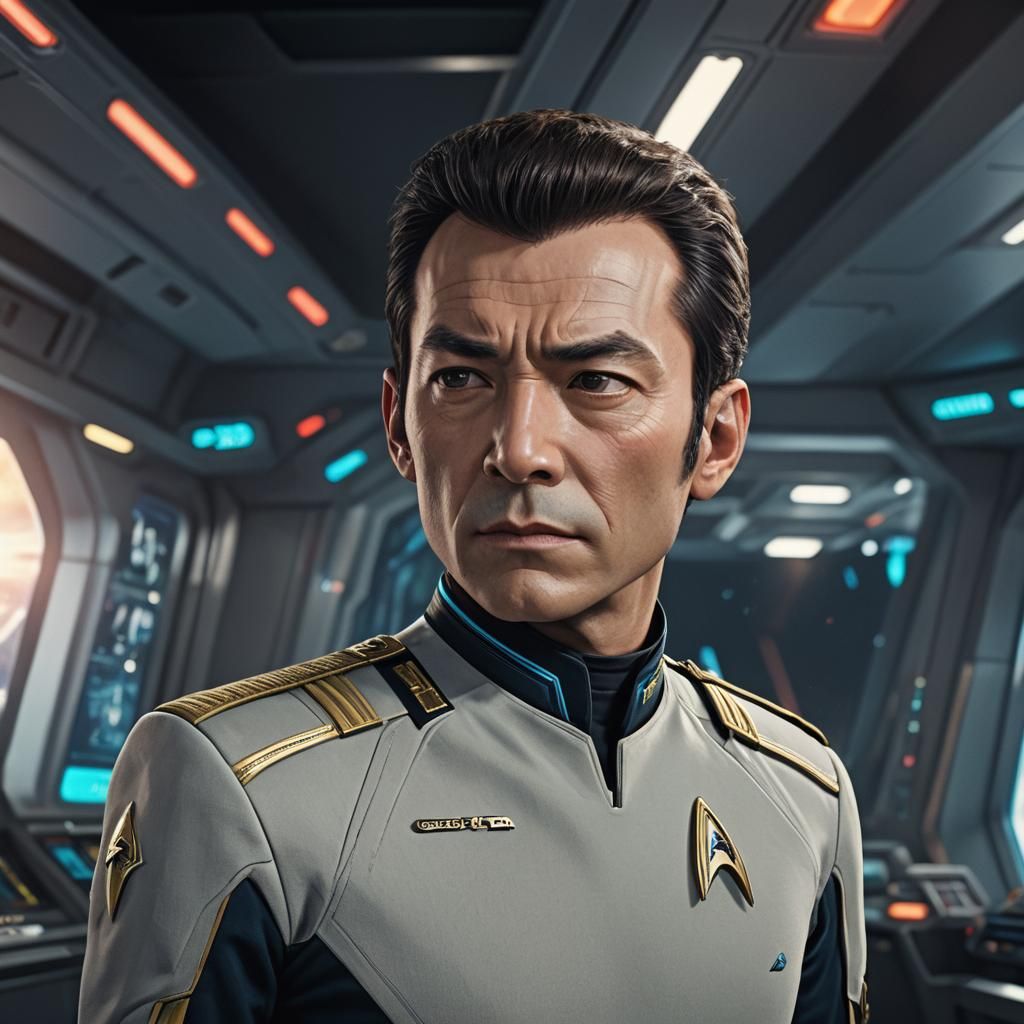 A striking digital artwork of a Star Trek captain on the Enterprise bridge. Rendered with anime-inspired 3D techniques, the portrait features vibrant colors, realistic textures, and cinematic lighting.