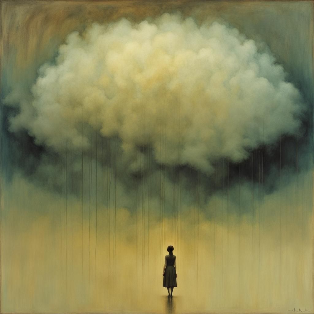 A surreal image of a woman's head surrounded by glowing orbs transforming into dreamscapes. This digital artwork features soft, muted colors and a blend of reality and fantasy.