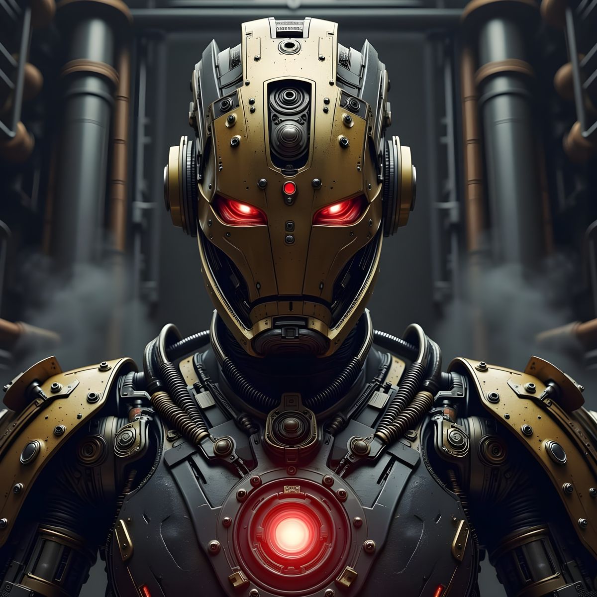 This image shows a close-up of a powerful Steampunk Iron Man. It features intricate details, a bronze helmet, glowing chest, and dramatic lighting in an industrial aesthetic.
