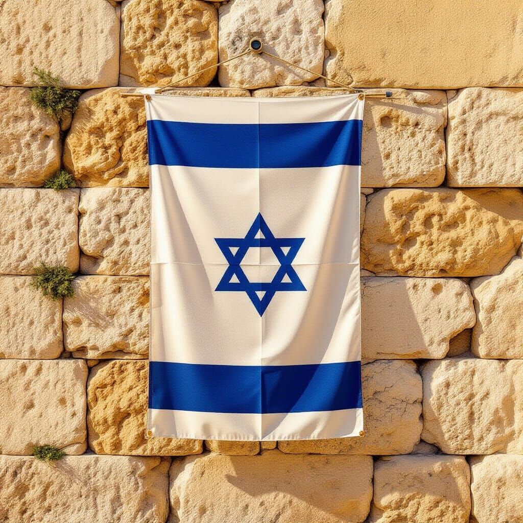 This hyperrealistic digital painting shows the Israeli flag hanging on a textured, ancient Jerusalem stone wall. Warm sunlight highlights the flag's resilience and the stone's age, evoking pride and history.