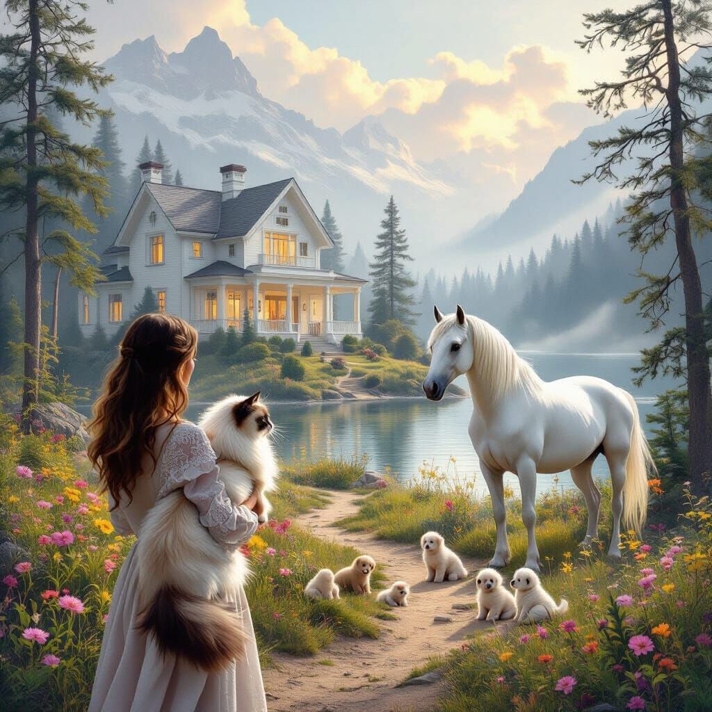 This image depicts a woman holding a Siamese cat, looking towards a large white house with a dog nearby. A white horse, puppies, and a misty forest setting create a serene, painterly scene with atmospheric lighting.