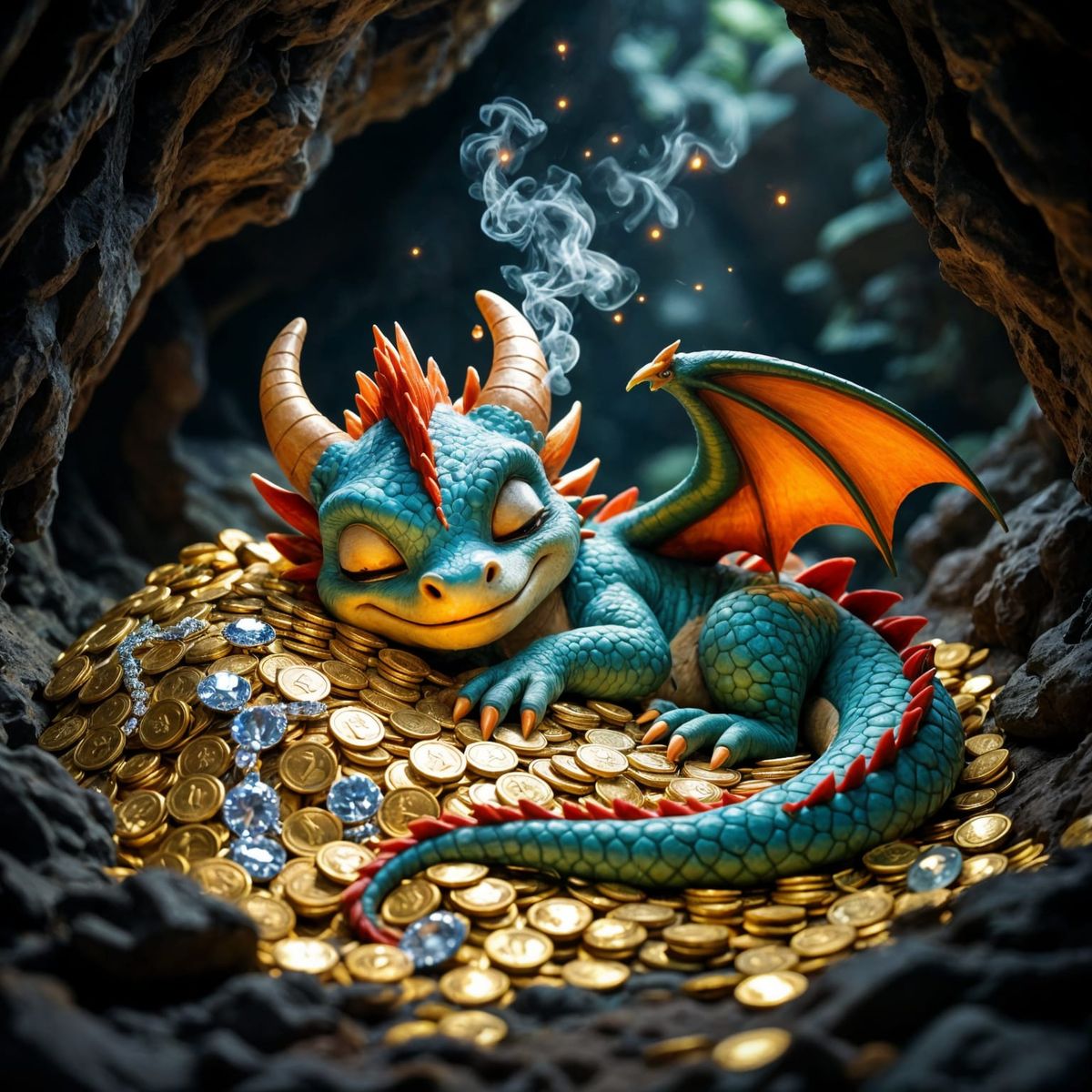 In a cave, a young, colorful dragon lies curled up, sleeping with a wing draped over his head has one eye open. He lies in his nest of gold coins and jewelry and diamonds. A puff of smoke and a few sparks escape from his nose, cute and endearing. intricate details, HDR, beautifully shot, hyperrealistic, ...