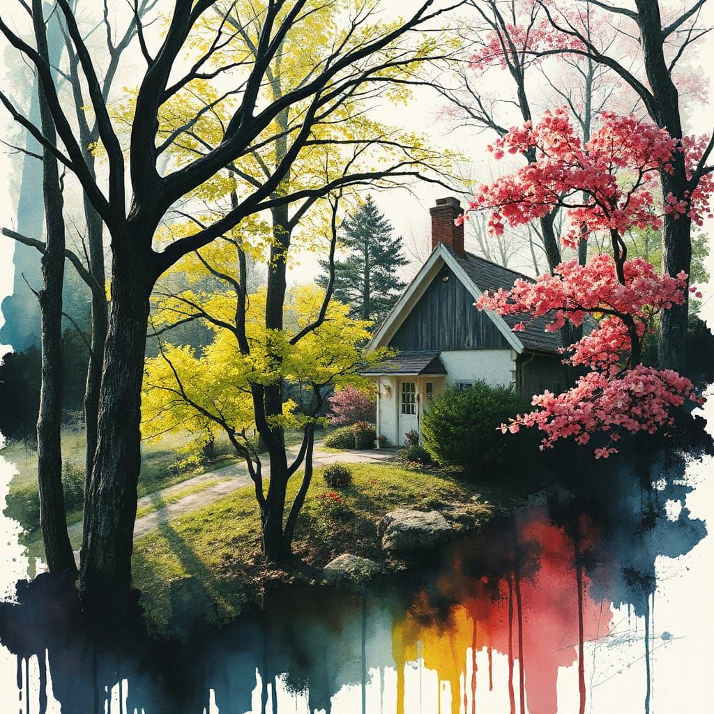 A vibrant forest cottage nestled among spring foliage, illuminated by morning light. This image blends watercolor and abstract expressionism, featuring bold forms, chaotic brushstrokes, and abstract geometry.