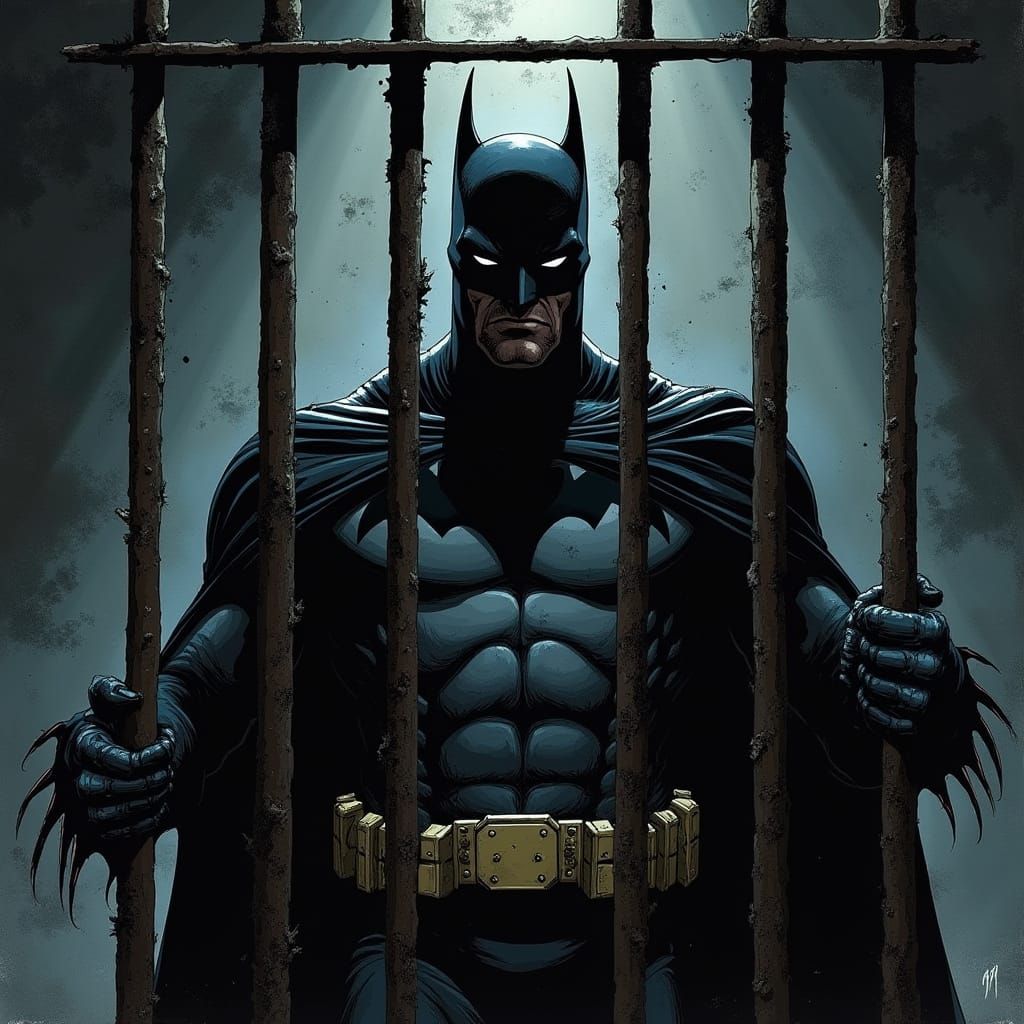 A gritty, film noir-inspired image of Batman standing behind ominous prison bars, with dramatic lighting and deep shadows, evoking the cinematic feel of a graphic novel