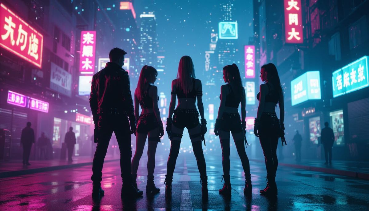 A striking picture of a silhouetted band performing against a vibrant cyberpunk cityscape. This cinematic image, reminiscent of Blade Runner, features film grain, vignette, and color grading for a dystopian aesthetic.