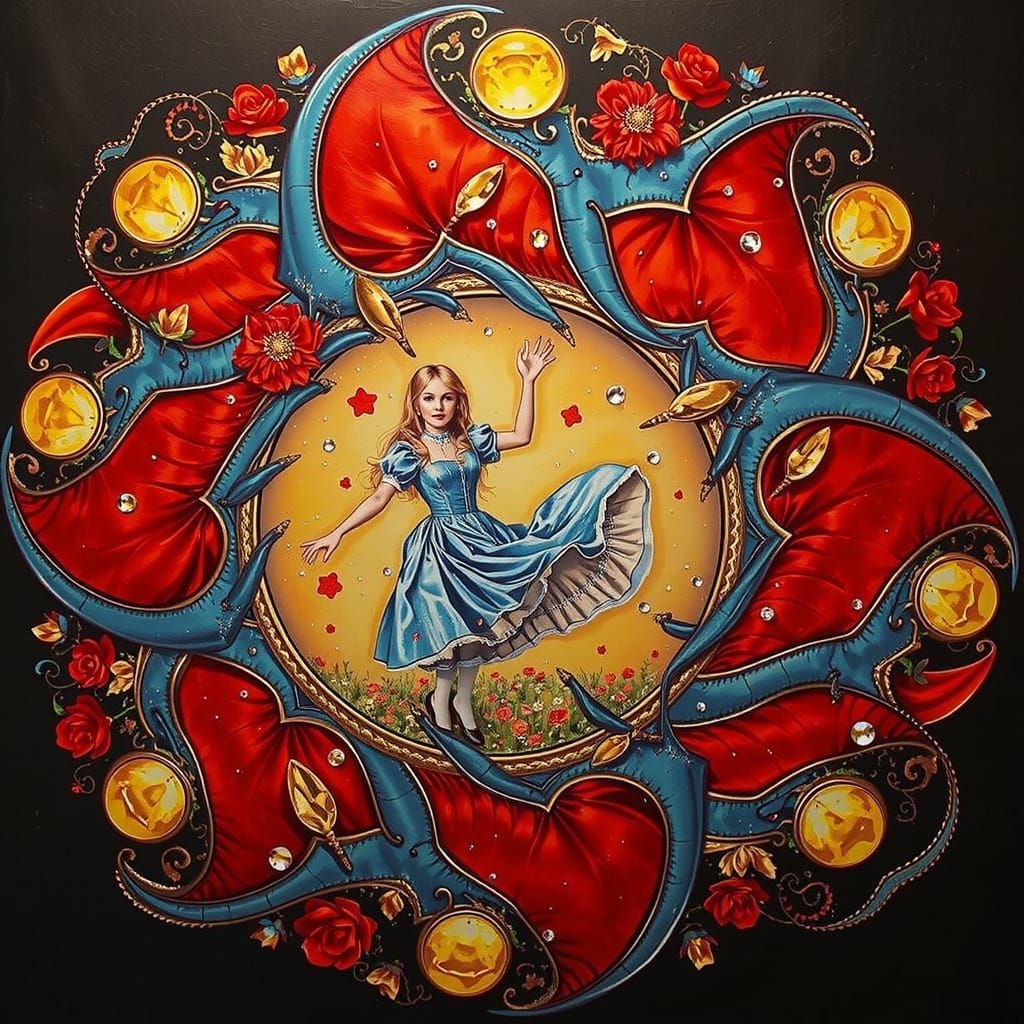 A photorealistic image showing Alice falling through the Looking Glass into Wonderland. The scene features vibrant flora and fauna, with a charming and hallucinatory atmosphere. The image has sharp focus and maximalist elements.