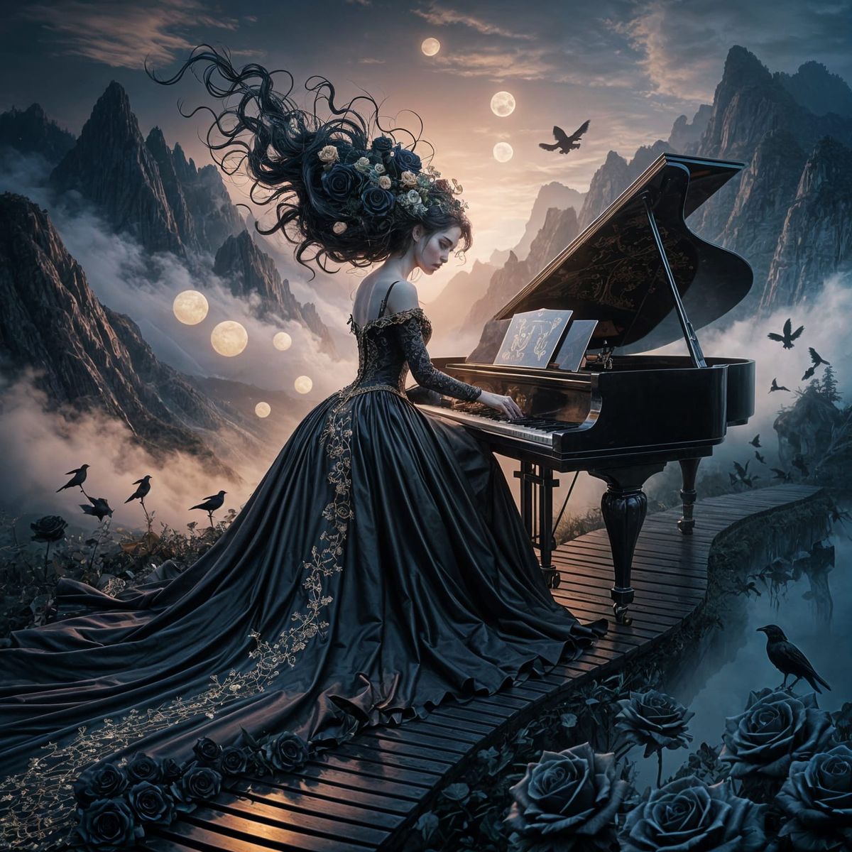 This image shows a gothic woman playing piano on a path through misty mountains. She is dressed in a dark gown with golden embroidery, illuminated by twilight in a haunting, magical scene as digital art.