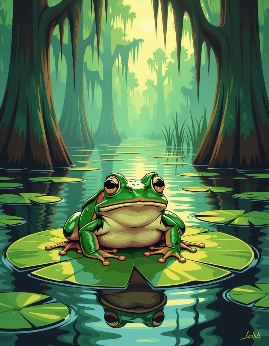 A striking picture of a startled frog sitting on a lily pad. The surrounding murky water and cypress trees are rendered with vibrant earthy tones and dramatic lighting, as digital art.