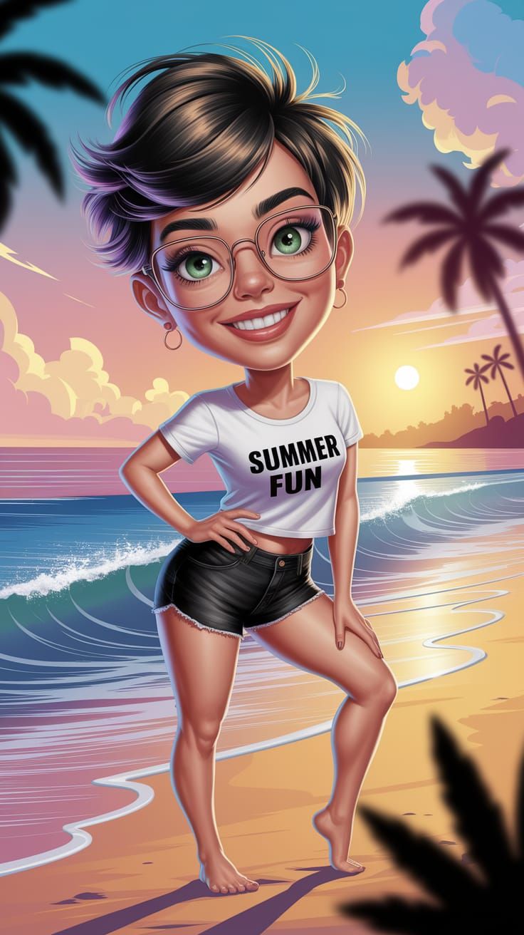 A vibrant image shows a cheerful woman with green eyes and a pixie cut on a sunset beach. She wears a "Summer fun" t-shirt as pastel clouds drift by in this cartoon-style illustration.