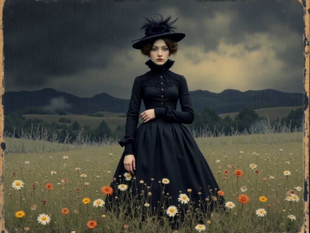 A serene image of a modern goth girl framed by wildflowers in the rain. The artwork is reminiscent of everyday realism with muted tones and soft textures, evoking tranquility.
