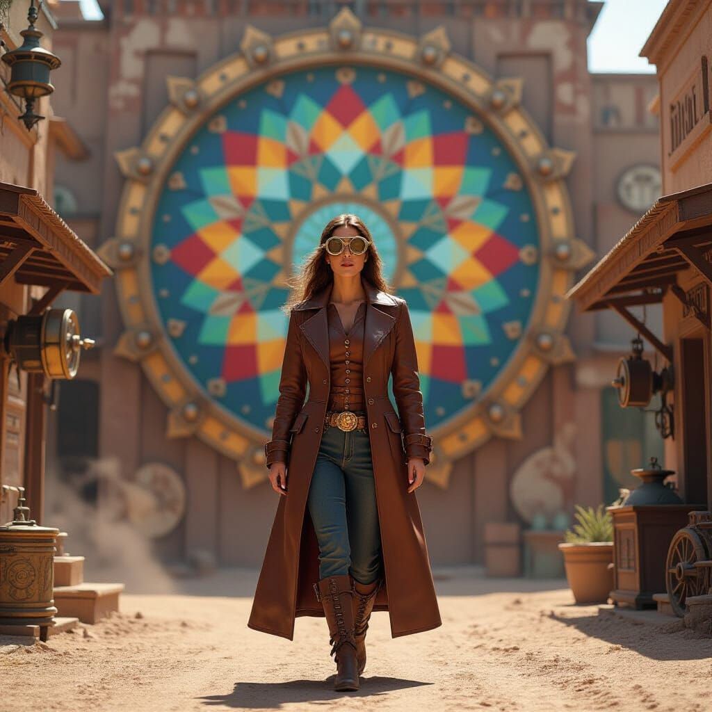 A woman in goggles stands before kaleidoscope wall art in a steampunk city. The image blends sci-fi with vintage aesthetics, showcasing intricate gearwork and steam-powered machinery.