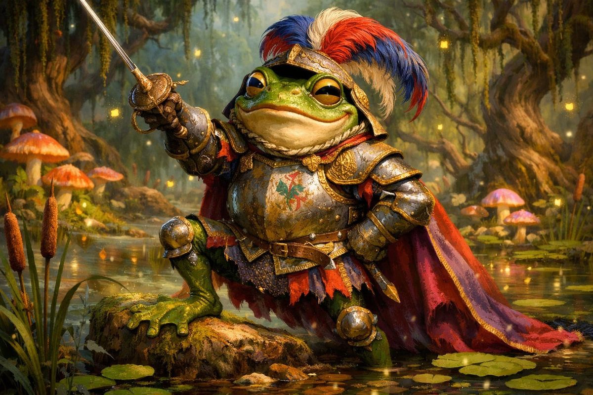A hyperdetailed image of a frog-folk noble, the Bullywug Knight, posing proudly in a whimsical Feywild swamp. The knight wears ornate, ill-fitting ceremonial armor and wields a rapier in a dramatic stance.