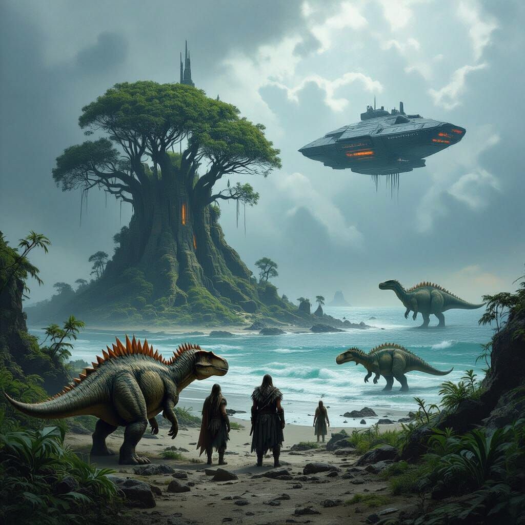 This image depicts a storm-ravaged, desolate island in a dystopian future. Celtic figures surround a world tree, while dinosaurs roam and a spaceship looms. The artwork has a dark, industrial aesthetic.