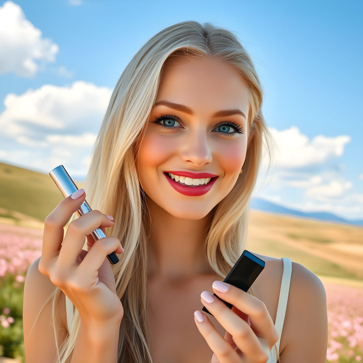 A striking picture of a blonde woman applying makeup in a sunlit room. She wears delicate makeup and exudes confidence, set against a vibrant landscape, rendered with hyperrealism.