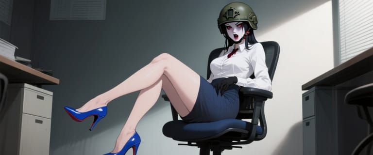 This image features a striking anime-style vampire woman in a skirt, blouse, and combat helmet, seated in an office chair with a predatory gaze. Cinematic lighting enhances the detailed textures.