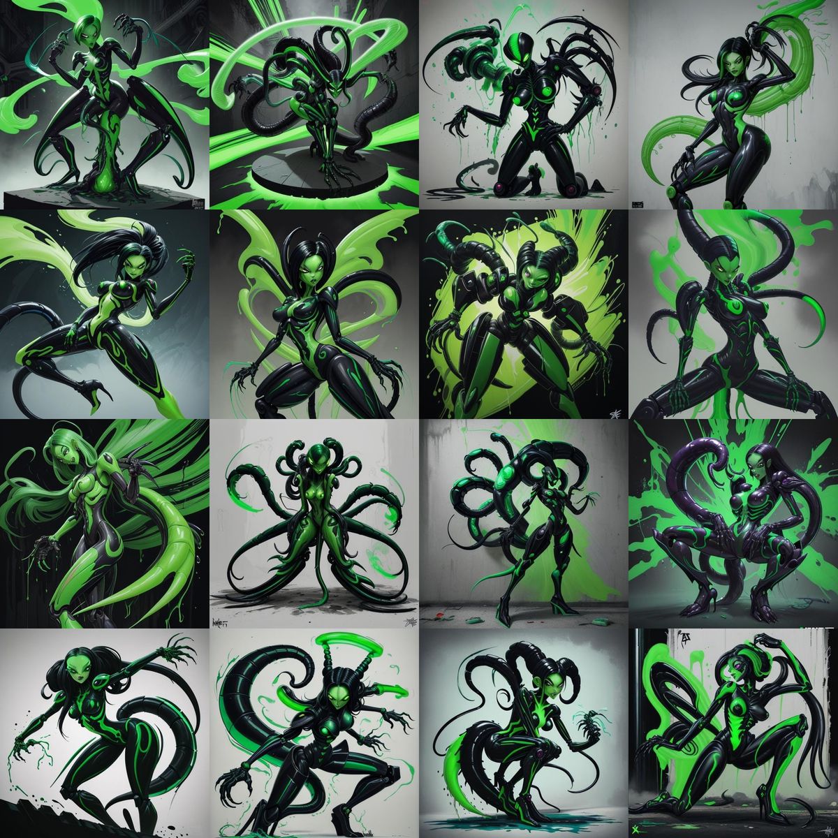 A digital rendering of Shego reimagined as a Xenomorph robot. The figure features an invertebrate-like body, protective exoskeleton, and a blade-tipped tail with green flames, in a graffiti art style.