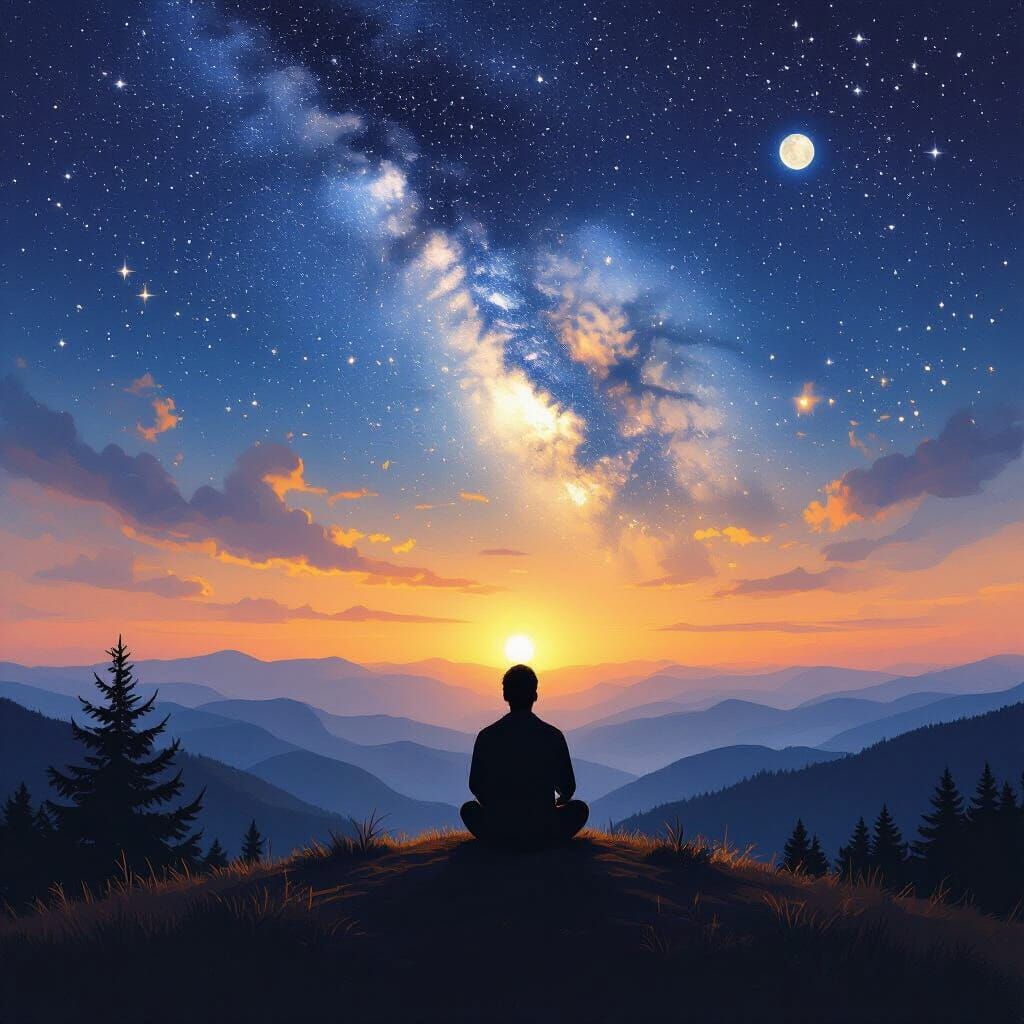 This image shows a man in silhouette praying on a hill under a starry night sky. The scene evokes serenity and devotion, rendered in an oil painting style with dramatic lighting.