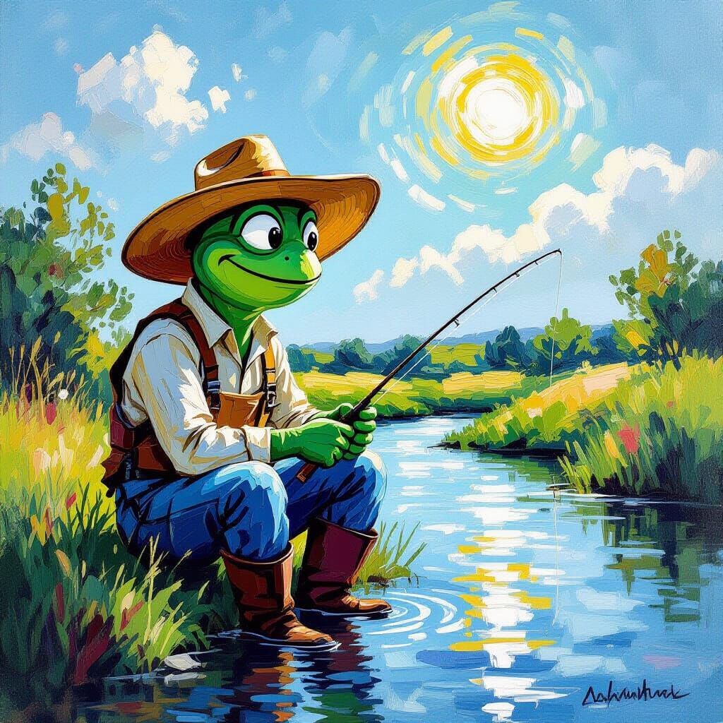 This image shows a friendly Nightcrawler in a hat fishing on a creek bank. Rendered with thick, textured impasto gouache brushstrokes, it evokes a maximalist impressionist masterpiece.