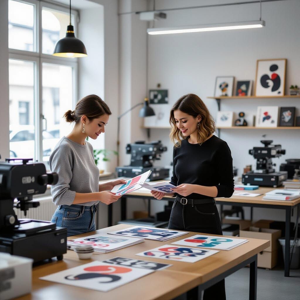 This image shows a modern typography workshop creating colorful printed materials. The minimalist aesthetic evokes classic Swiss design principles with sleek machinery and diverse fonts.